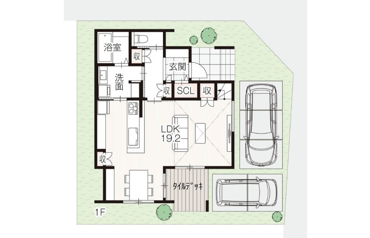 吹抜と天井に設けられた化粧梁が空間にアクセントを加え、木の温もりを感じるモダンな雰囲気に。外とつながるタイルデッキスペースもあり、屋外との一体感が感じられます。